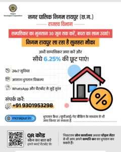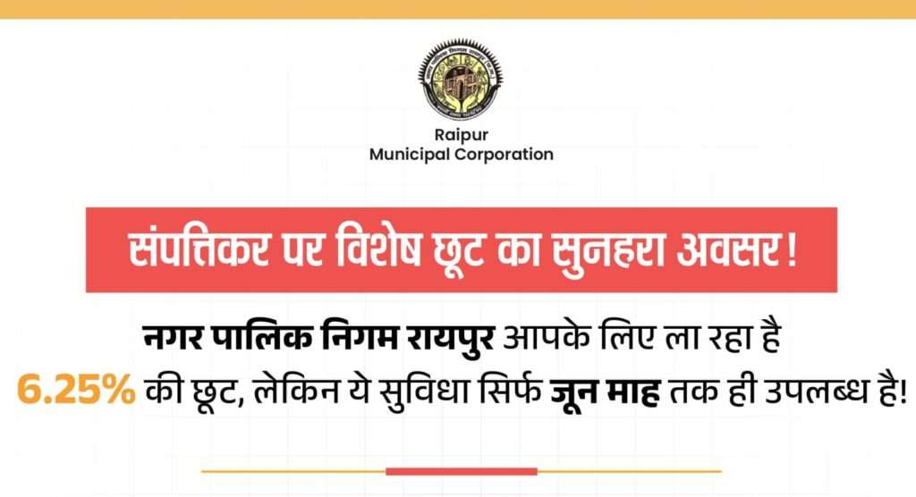 रायपुर -रायपुर नगर पालिक निगम के राजस्व विभाग द्वारा दिनांक 30 जून 2025 तक वित्त वर्ष 2025-26 के सम्पतिकर का पूर्ण भुगतान करने वाले सम्पति करदाता नागरिकों को सम्पतिकर में 6.25 प्रतिशत की छूट प्रदान की जा रही है. नगर पालिक निगम रायपुर के राजस्व विभाग को कोई भी सम्पति करदाता नागरिक ऑनलाइन / ऑफलाइन सम्पतिकर भुगतान व्हाट्सएप्प, चैटबॉट क्यूआरकोड आदि उपलब्ध अनेक विकल्पों के माध्यम से अपनी सुविधा अनुसार दिनांक 30 जून या उसके पूर्व करके सम्पतिकर के चालू वित्त वर्ष 2025-26 के भुगतान में 30 जून तक अधिकतम 6.25 प्रतिशत की छूट प्राप्त कर सकते हैँ. रायपुर नगर पालिक निगम के राजस्व विभाग द्वारा समस्त सम्पति करदाता नागरिकों से 30 जून अथवा उससे पहले वर्ष 25-26 के अपने देय सम्पतिकर का पूर्ण भुगतान कर 6.25 प्रतिशत की अधिकतम छूट का लाभ अधिकाधिक संख्या में उठाने की अपील की है.इसमें विस्तृत जानकारी प्राप्त करने के इच्छुक सम्पति करदाता नागरिक सम्बंधित जोन कार्यालय के राजस्व विभाग में सम्पर्क स्थापित कर सकते हैँ.