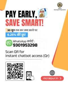 निगम राजस्व विभाग की सभी सम्पति करदाता नागरिकों से 30 जून या उसके पूर्व वर्ष 25-26 का सम्पतिकर भुगतान कर छूट का पूर्ण लाभ लेने की अपील