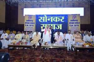 रायपुर। उप मुख्यमंत्री श्री अरुण साव आज शहीद स्मारक भवन रायपुर में छत्तीसगढ़ सोनकर समाज के नवनिर्वाचित जनप्रतिनिधियों का सम्मान किया। इस समारोह में श्री साव ने सोनकर समाज को संबोधित करते हुए कहा कि, समाज के गौरव एवं नगर माता बिन्नी बाई सोनकर ने स्कूल के लिए अपनी जमीन दान कर लोगों को शिक्षित करने में महत्वपूर्ण भूमिका निभाई। उन्होंने आंबेडकर अस्पताल में धर्मशाला बनवाने के लिए लाखों रुपए दान दिया। आज सोनकर समाज उन्हें समाज उनसे प्रेरणा लेकर शिक्षा के क्षेत्र में सराहनीय कार्य कर रहा है।