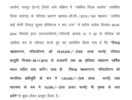 गुरुवार (13 सितंबर 2025) को राज्य उपभोक्ता आयोग ने सुयश हॉस्पिटल को दोषी मानते हुए आदेश दिया है कि अस्पताल मृतक के परिजनों को –
