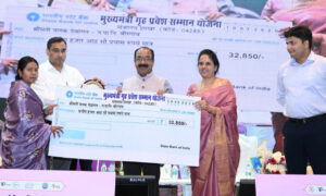 उप मुख्यमंत्री श्री साव ने निर्धारित समयावधि में प्रधानमंत्री आवास का निर्माण पूर्ण कर मुख्यमंत्री गृहप्रवेश सम्मान का हकदार बनीं रायपुर की श्रीमती रजनी ध्रुव, कुम्हारी की श्रीमती गीता पाल और बीरगांव की श्रीमती पलक देवांगन को (प्रत्येक को) 32 हजार 850 रुपए का चेक प्रदान किया। उन्होंने प्रधानमंत्री स्वनिधि योजना के अंतर्गत रायपुर नगर निगम की तीन स्ट्रीट वेंडर्स श्रीमती लक्ष्मी साहू, श्रीमती रत्ना दीप और श्रीमती बी. लावण्या को 50-50 हजार रुपए के चेक सौंपे।